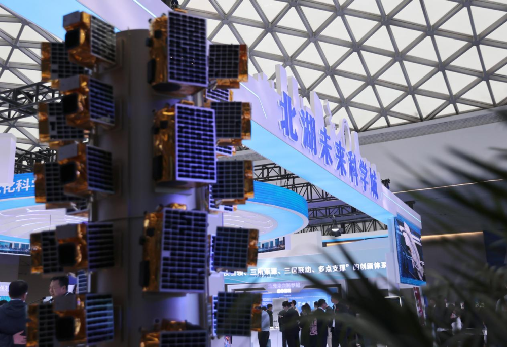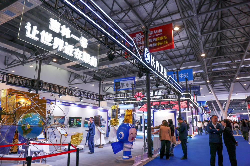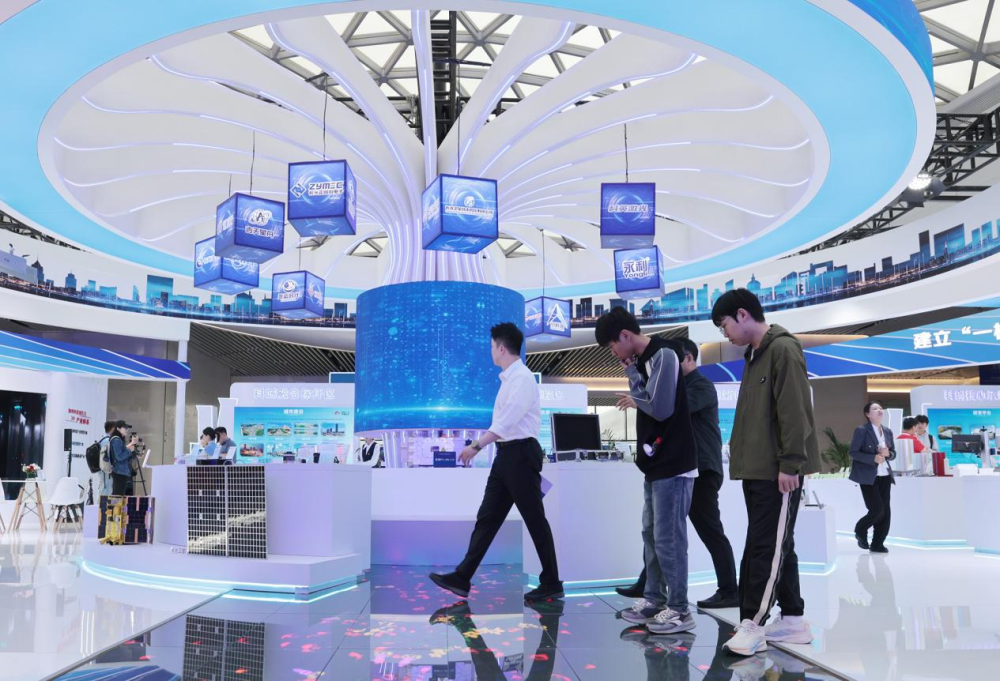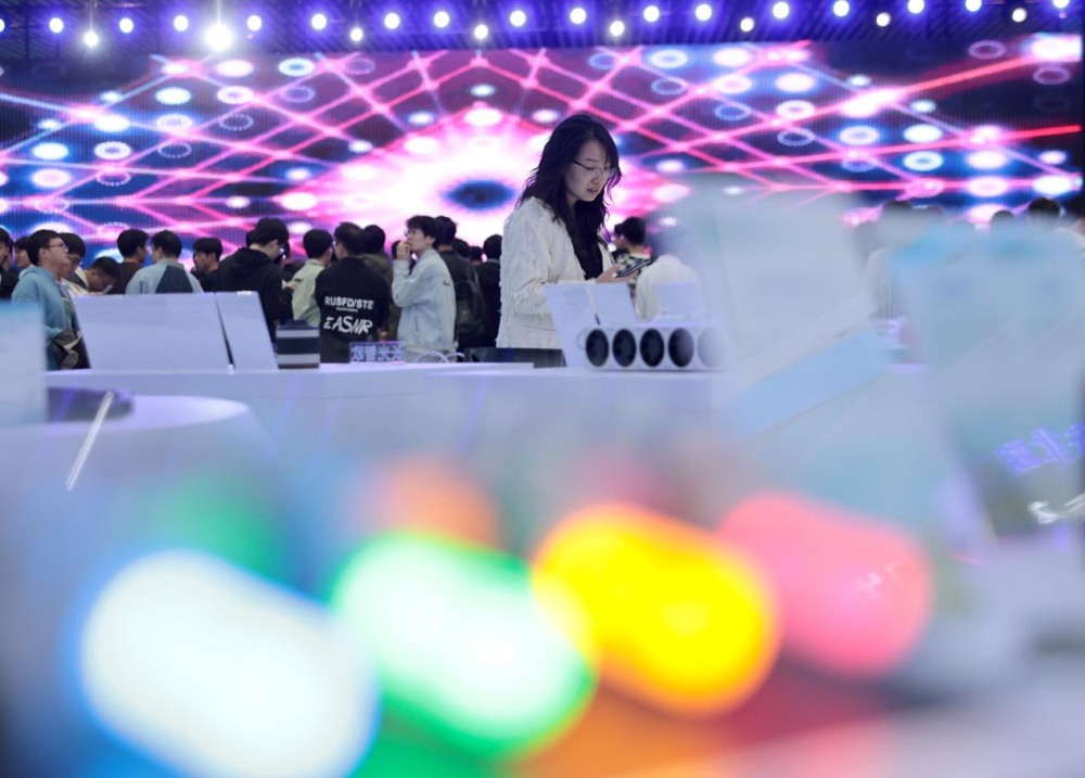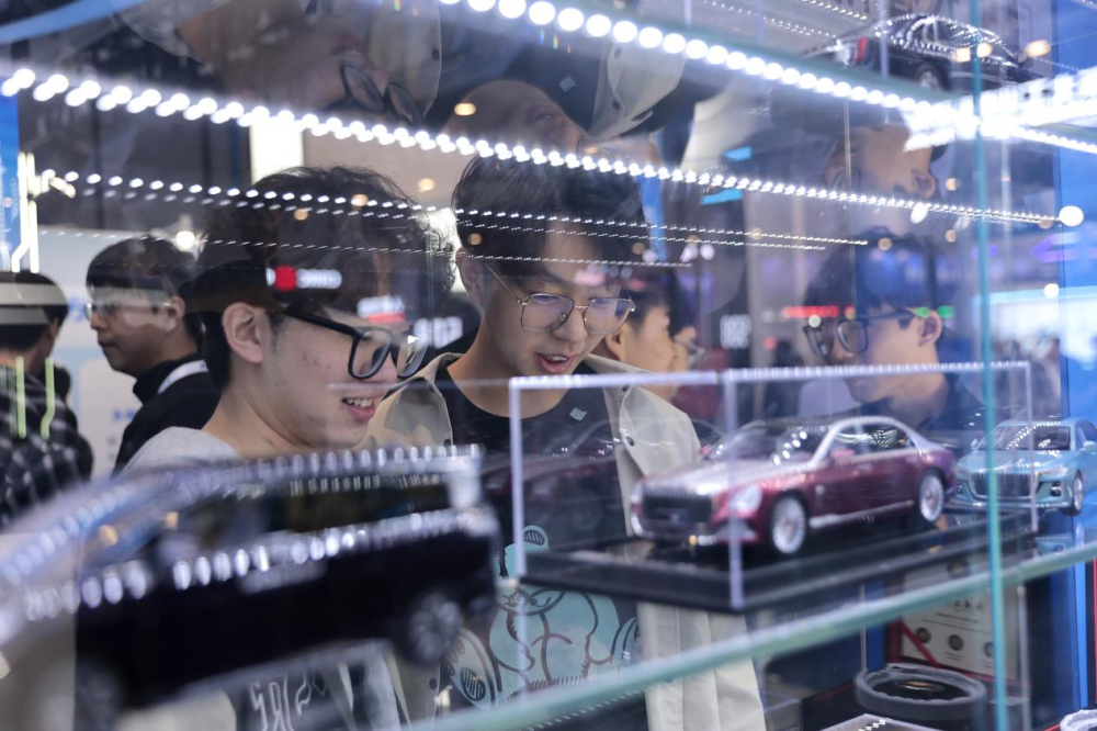 這是兩名觀眾在參觀2025長春光博會長春汽開區展區的展品。