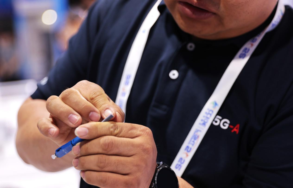 在2025長春光博會現場一位工作人員正在講解光纖設備。