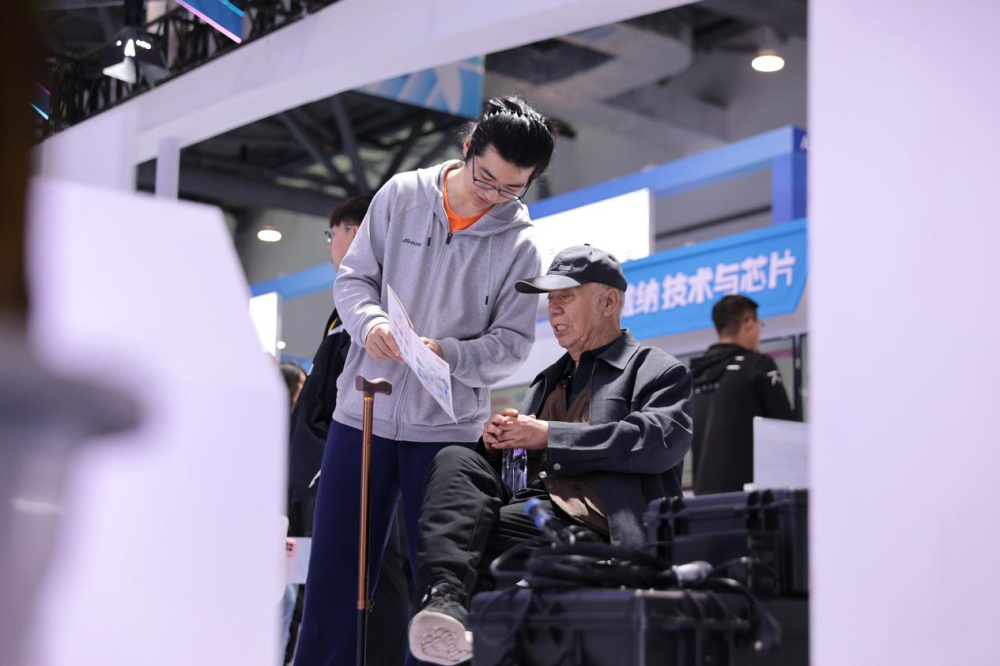 在2025長春光博會長春理工大學展區,一位工作人員正在給一位觀眾講解。