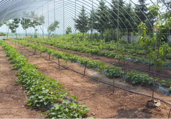 近日,在松江鎮靠山村錦繡黃桃種植冷棚內,一棵棵桃樹排列整齊。套種的地瓜秧苗長勢喜人,肥厚的葉片層層疊疊,展現出一派生機勃勃的景象。