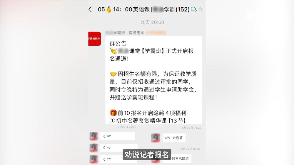 經過幾天交流,助教老師開始推介其所在培訓機構重點打造的“清北學霸班”,稱其為“市面上能接觸到最好的教育資源”,隨后將記者拉入報名群中,并持續通過語音電話、留言等方式勸說記者報名。