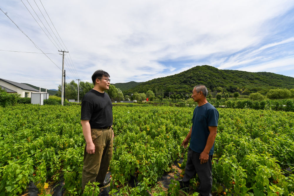 ↑ 8月11日,在磐石市官馬新村,馬鋮明(左)和村民查看紅菇娘長勢。