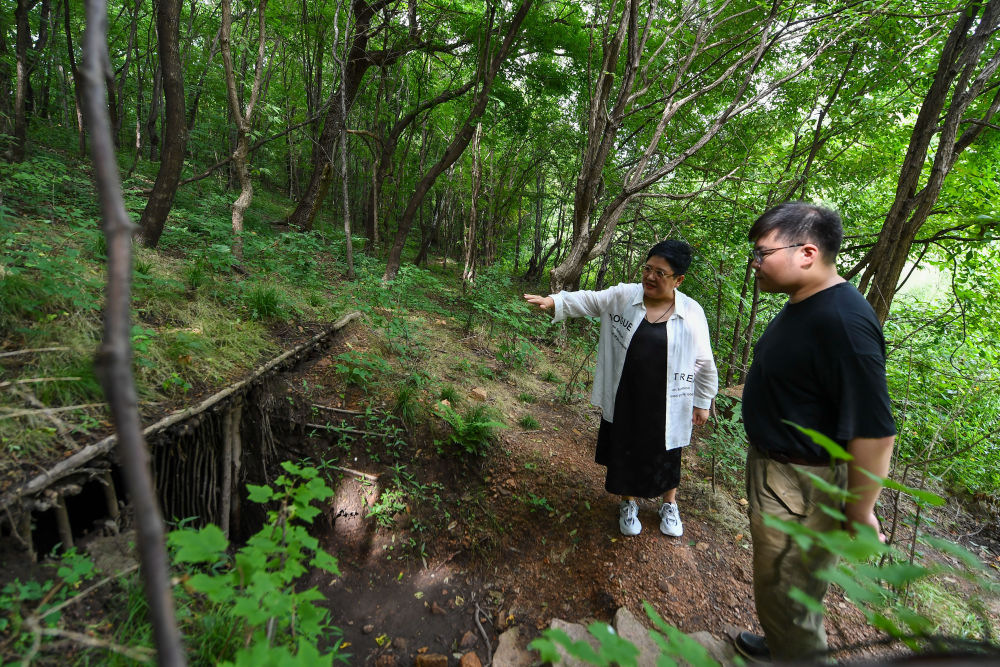 ↑ 8月11日,在位于吉林磐石的紅石砬子抗日根據地遺址,磐石市抗日斗爭紀念館館長李秋虹(右)向馬鋮明介紹抗聯歷史。