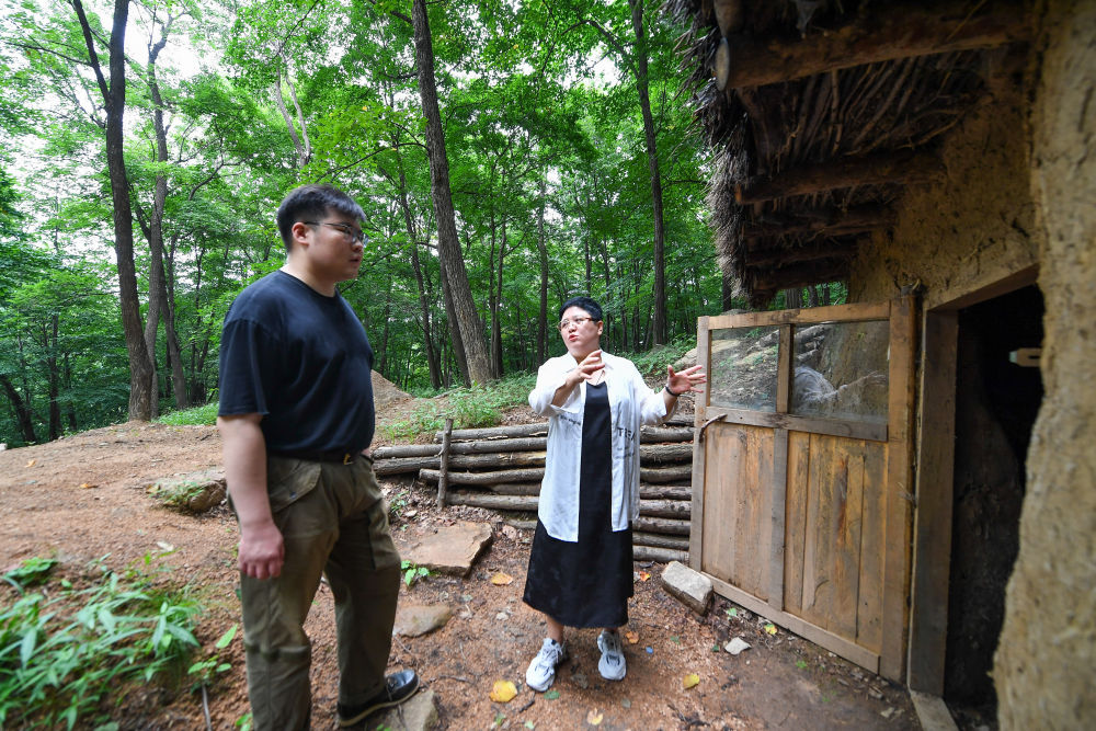 ↑ 8月11日,在位于吉林磐石的紅石砬子抗日根據地遺址,磐石市抗日斗爭紀念館館長李秋虹(左)向馬鋮明介紹抗聯歷史。