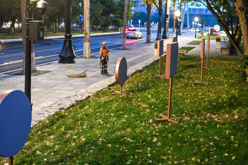 10月1日,環衛工人在長春市新民大街清掃公交站臺。新華社記者 張楠 攝