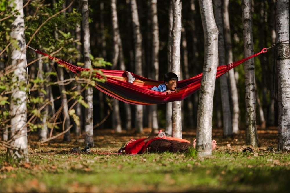10月6日,一位小朋友與家長在長春市南湖公園白樺林間享受秋日陽光。新華社記者 許暢 攝